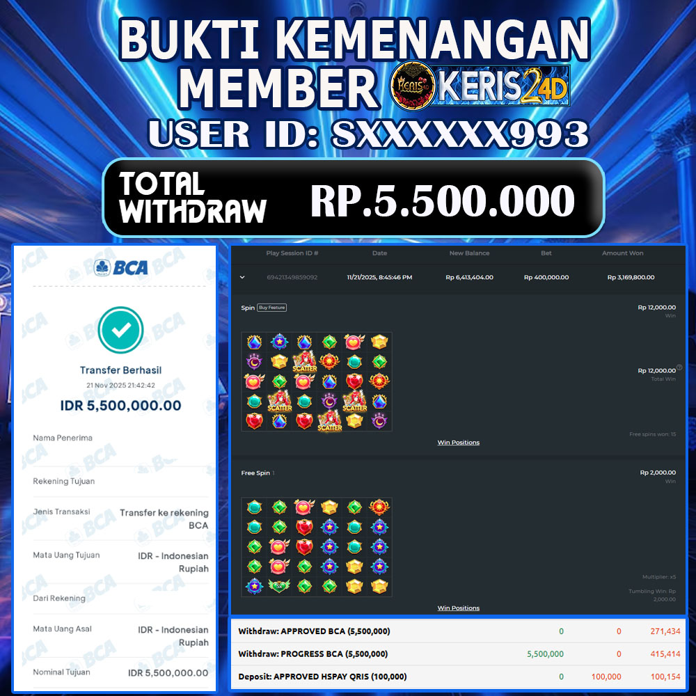 Setiap hari, member KERIS24D berhasil meraih jackpot besar dari berbagai provider slot ternama yang kami sediakan, seperti Pragmatic Play, Habanero, PG Soft, dan masih banyak lagi. Kami secara rutin menampilkan bukti screenshot atau rekapan kemenangan yang berhasil diraih, mulai dari kemenangan ratusan ribu hingga puluhan juta rupiah. Semua slip kemenangan ini kami hadirkan untuk membuktikan bahwa di KERIS24D, peluang menang itu nyata.