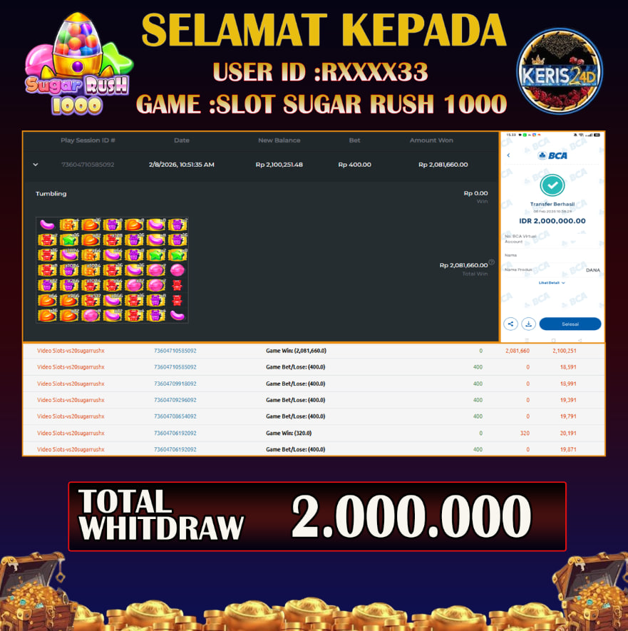 JACKPOT SLOT SUGAR RUSH 1000 1000 FEBRUARY 08 2026, Jackpot Slot Gacor, Kemenangan Slot, Bukti Kemenangan Slot, Kemenangan Slot PgSoft, Menang Slot online, Slot Gacor, Situs Aman Terpercaya, WD Berapapun Pasti DI Bayar Tuntas, Maxwin Slot Online.