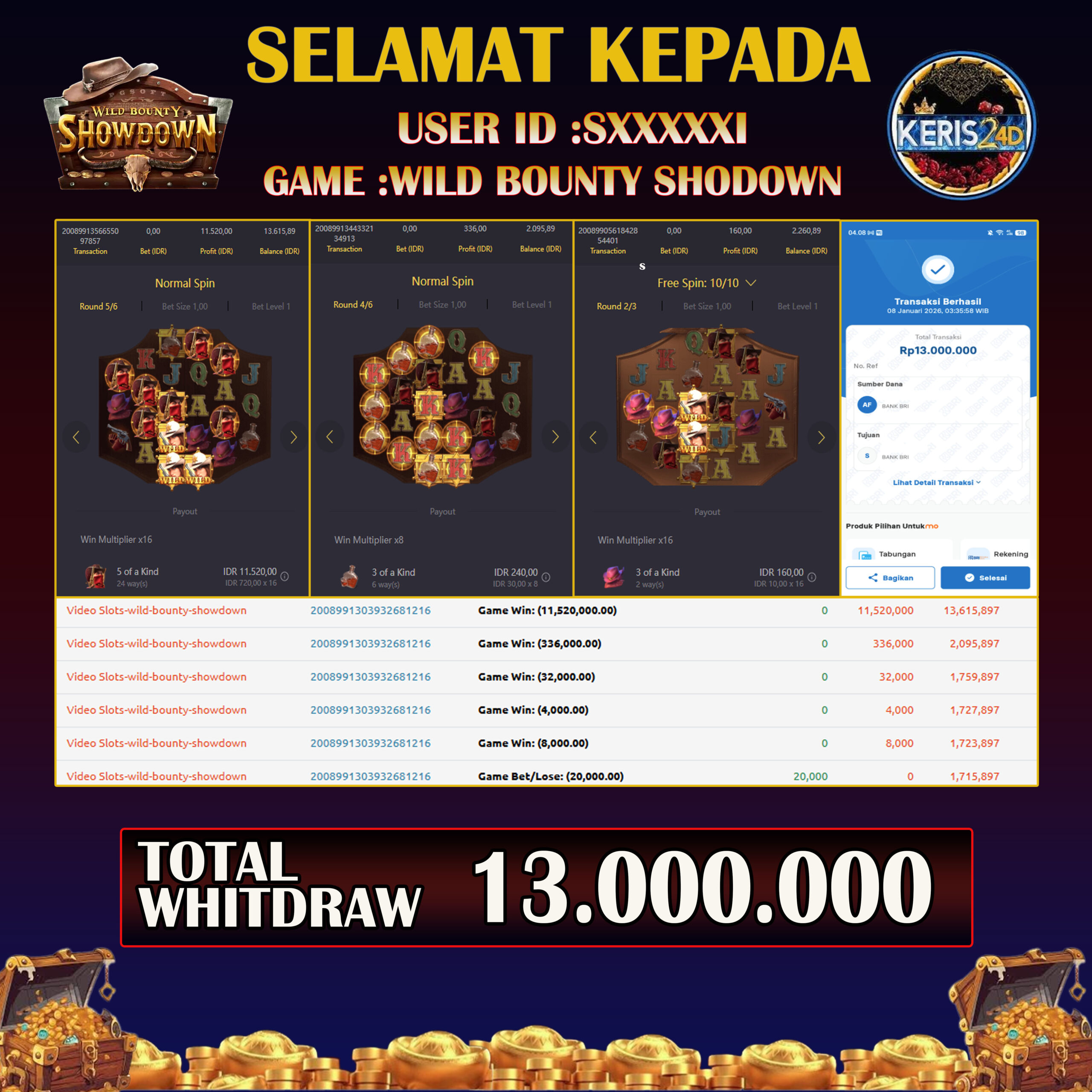 TOTAL KEMENANGAN : Rp 13.000.000,-